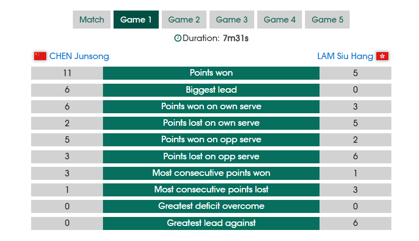第一局开场陈俊菘拼的很凶,开场4-2领先,随后6-3继续领先,陈俊菘8-4拉开分差,林兆恒连续失误5-10,最终陈俊菘11-5拿下第一局的胜利。